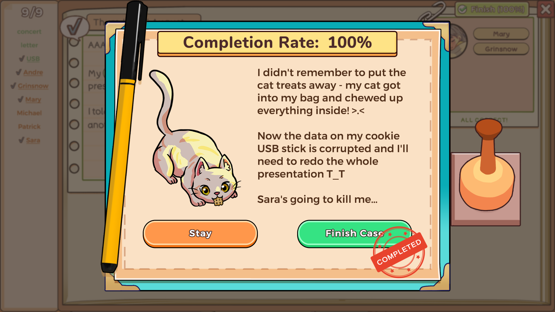 Cada caso é apresentado em cenários estáticos e ilustrados, e sua missão é vasculhar objetos, documentos e pistas escondidas para juntar as peças e resolver o mistério. O jogo conta com 10 casos distintos, cada um trazendo situações diferentes e cheias de personalidade.
