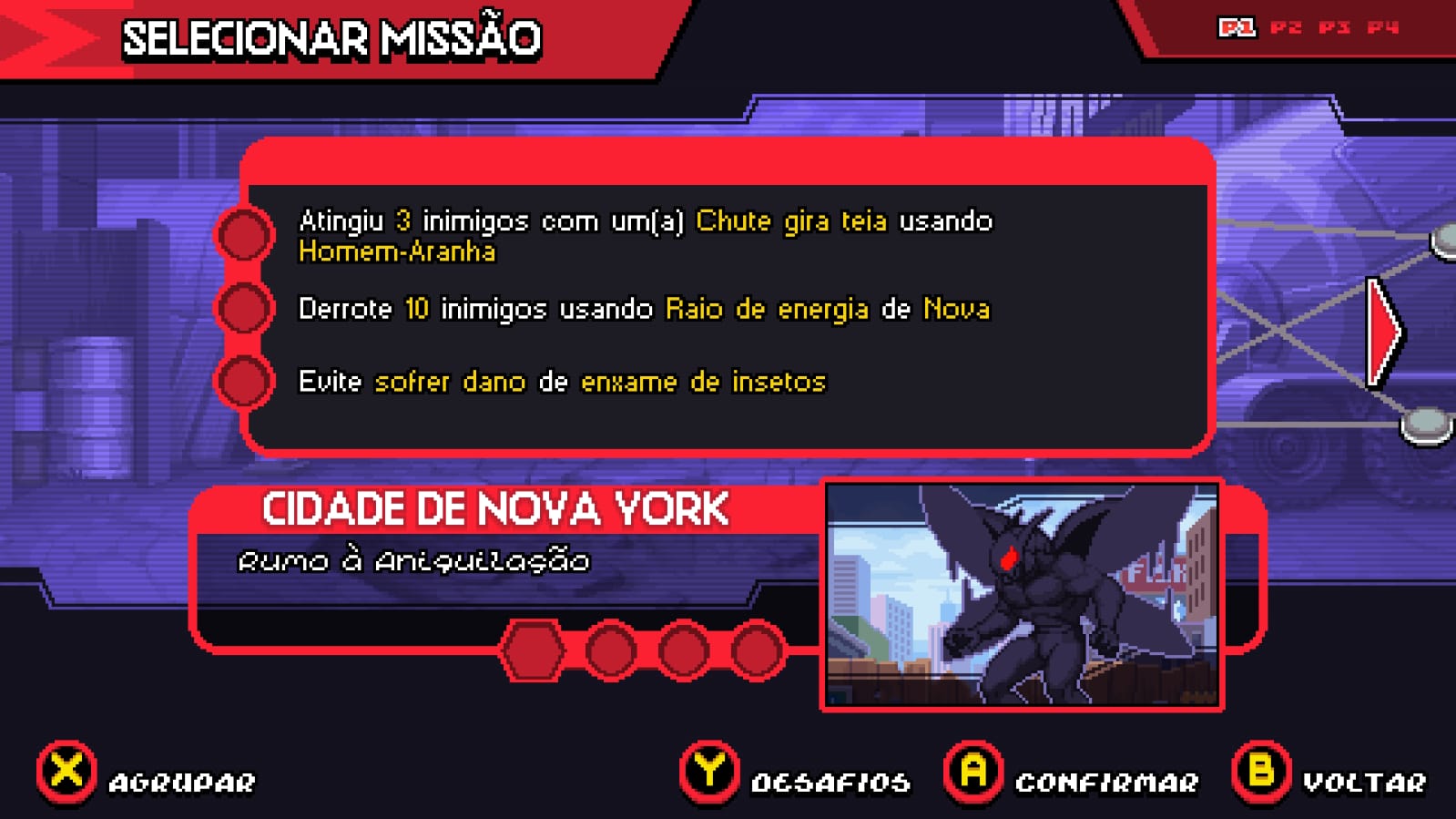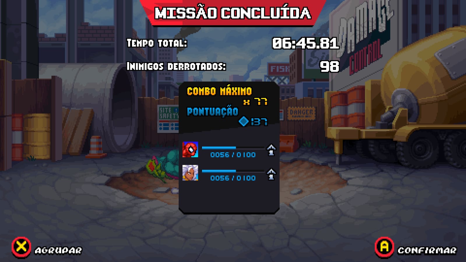 Um dos trunfos do jogo é a possibilidade de você completar missões em fases, além de evoluir seus heróis, elevando o jogo do patamar de ‘apenas mais um beat’em up’ para realmente um jogo interessante com objetivos e que incentiva a jogatina, a experiência.