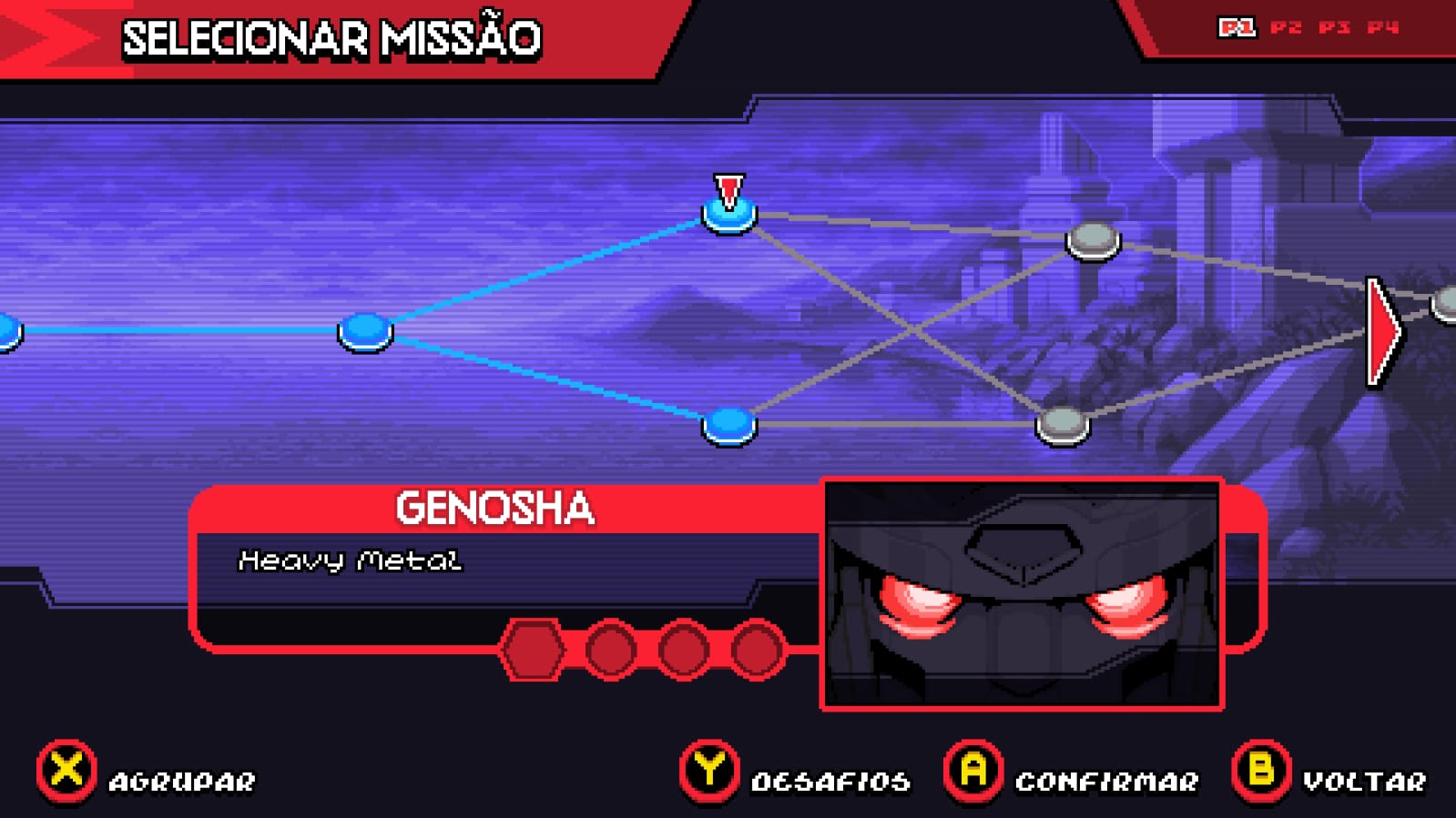 Os modos também reforçam essa proposta. A campanha é direta e cheia de chefes, enquanto o modo Arcade oferece aquela experiência raiz, com vidas limitadas e zero progresso salvo. Para completar, existe um cofre com artes, paletas de cores, trilhas, desafios e colecionáveis que expandem a longevidade do jogo.