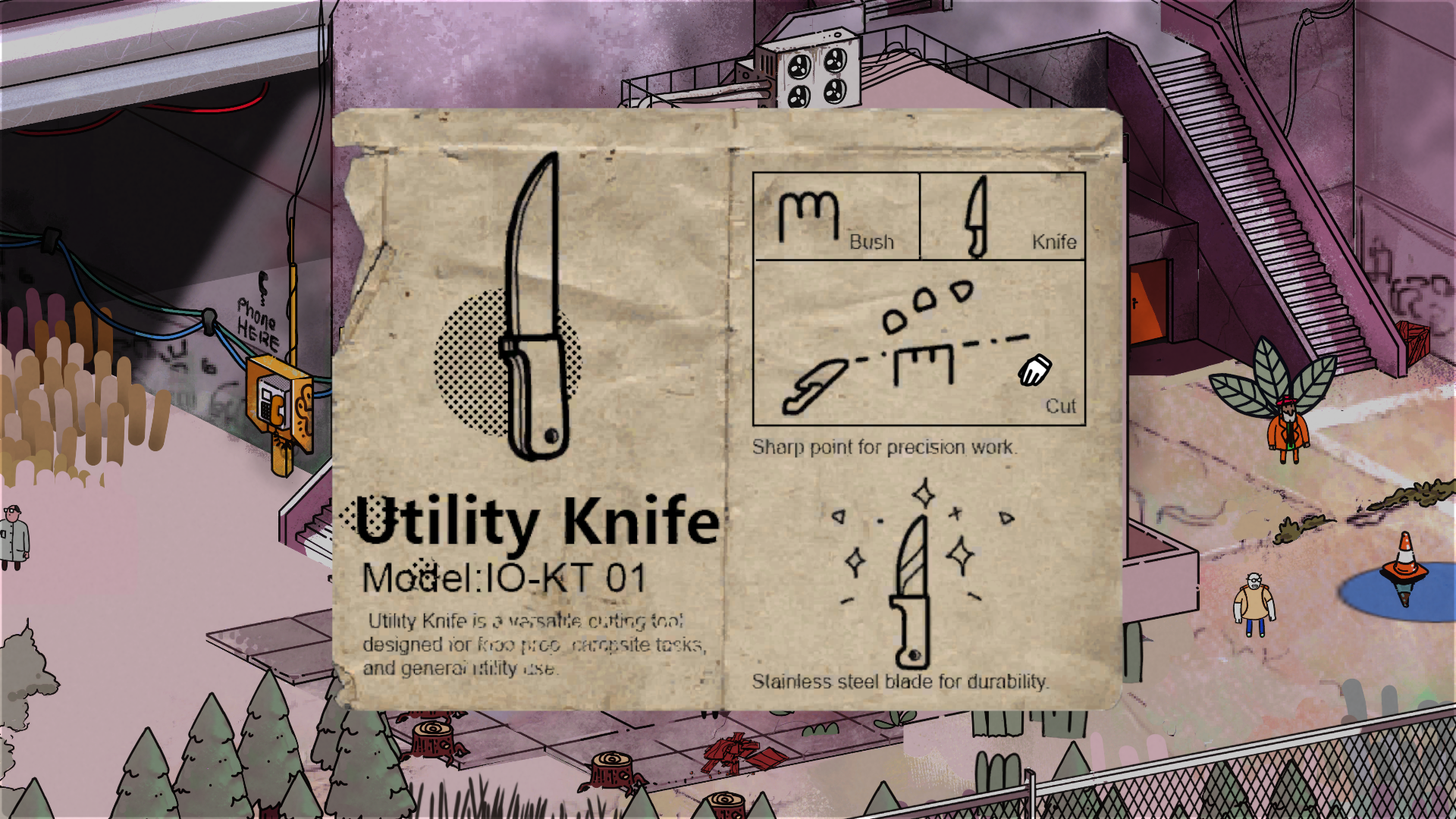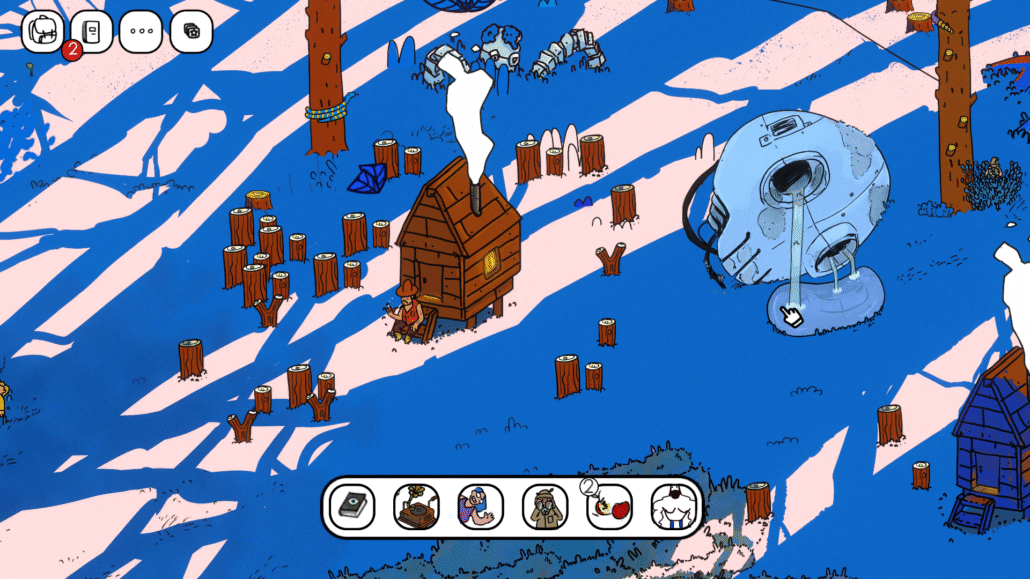 Essa ideia de esconder mecânicas dentro do cenário é o que faz OVERLOOK se destacar. Cada fase parece uma pequena maquete viva, cheia de mini-histórias, personagens curiosos e interações inesperadas. Um mecânico precisa de uma engrenagem? Entregue a ele. Um lenhador quer fatiar uma maçã? Pegue o machado dele e resolva a situação. Há sempre uma camada extra de descoberta e isso torna cada momento muito mais dinâmico do que o simples “achar o objeto da lista”.
